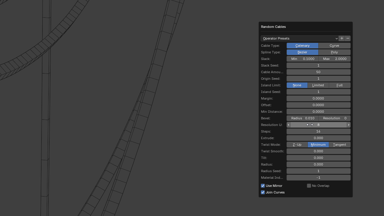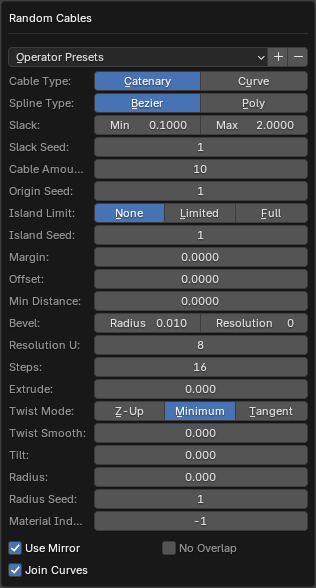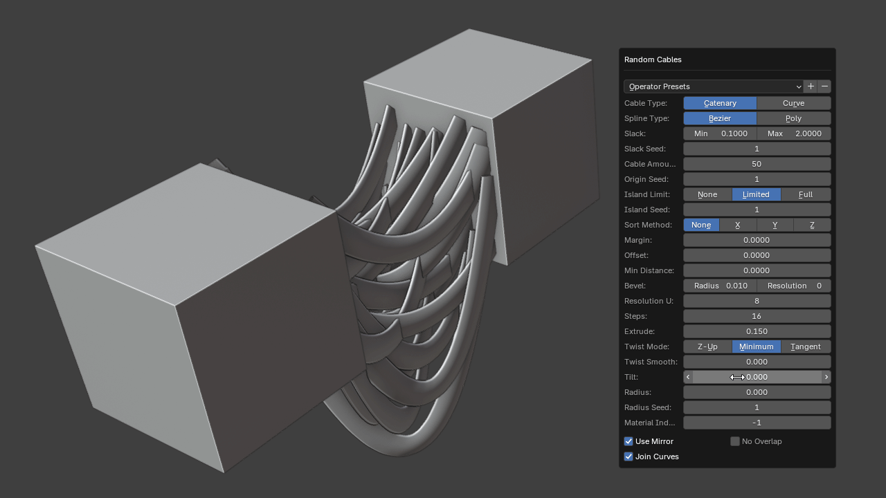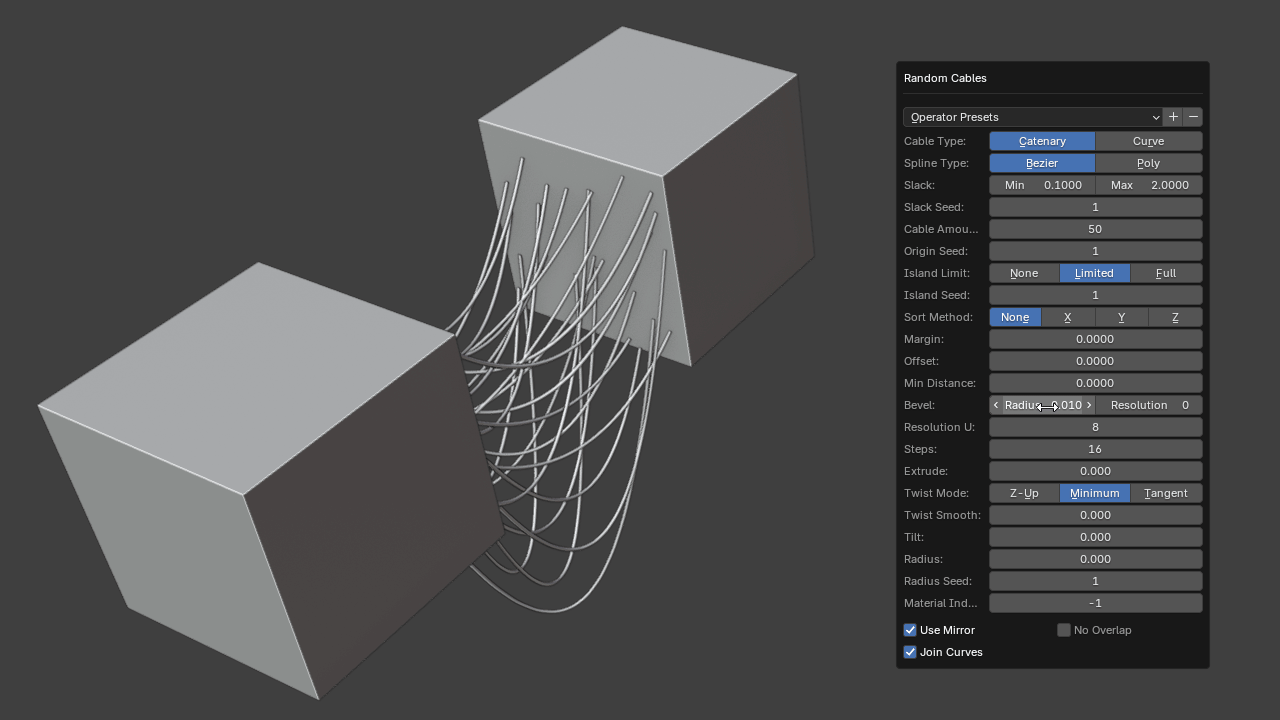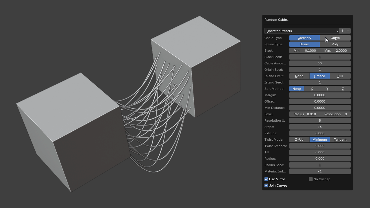 Random Cables creates catenary or straight cables from selected faces in multiple selected mesh objects. The resulting curve objects representing the cables will be connected depending on how many face islands or groups are selected from these objects.
