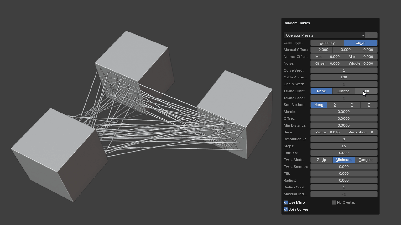 This randomizes which face islands will have the start/end points of the cables. The randomization will only happen when using Island Limit: Limited or Full and will randomize these end points between two face islands.