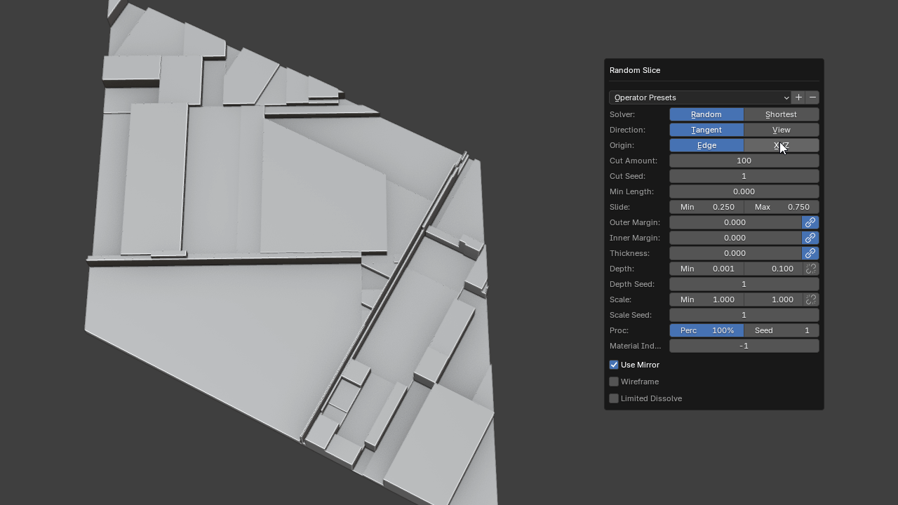 This has 2 options: **Random** and **Shortest**. **Random** will generate an edge cut from any random edge in a face. **Shortest** will only generate an edge cut from the shortest edge in a face which results to largely square/rectangular shapes avoiding long thin faces.